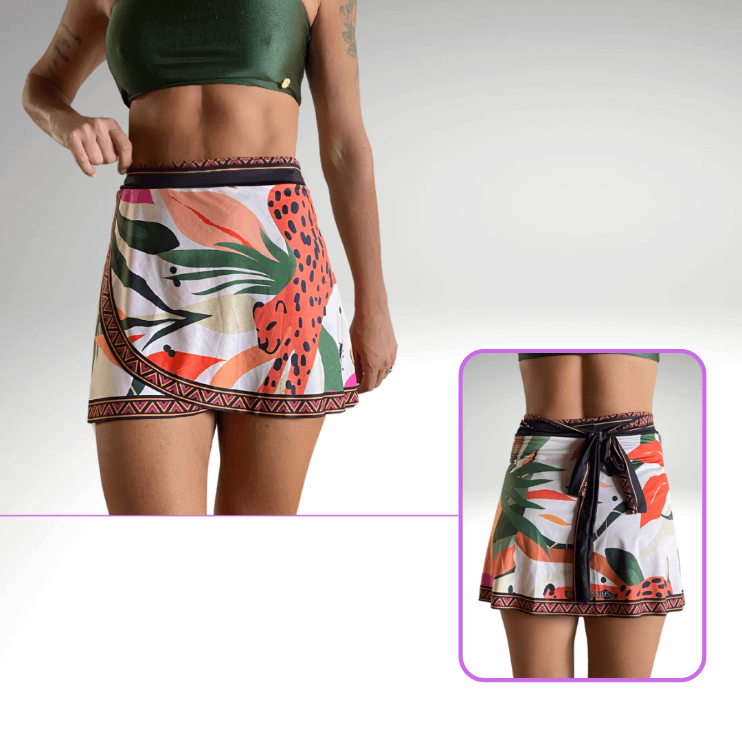 Com folhas tropicais e o detalhe da onça, a Saia Pareô Savana traz a força da floresta, autenticidade e o espírito do verão, ideal para quem quer se destacar na praia ou piscina.